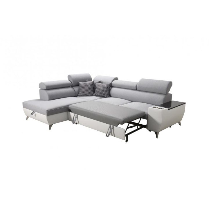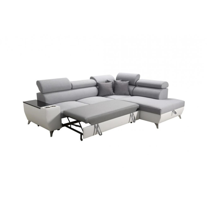 Wyposażenie obejmuje 5 regulowanych zagłówków, 1 pojemnik na pościel oraz otwierany barek, który poszerza zakres zastosowań mebla. Konstrukcja została wykonana na sprężynach falistych oraz utwardzonej piance T-30, przy wykorzystaniu tkanin najwyższej jakości. Całość wzmocniono stelażem na ramie drewnianej łączonej z płytą wiórową, co wpływa na trwałość i stabilność.