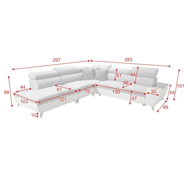 Całkowite wymiary narożnika wynoszą 283 cm szerokości, 297 cm głębokości oraz 101 cm wysokości, przy wysokości siedziska 47 cm. Krótszy bok ma 99 cm, co ułatwia zagospodarowanie narożnej części przestrzeni. Po rozłożeniu mebel zapewnia powierzchnię spania 210 × 127 cm, odpowiednią do okazjonalnego nocnego wypoczynku.