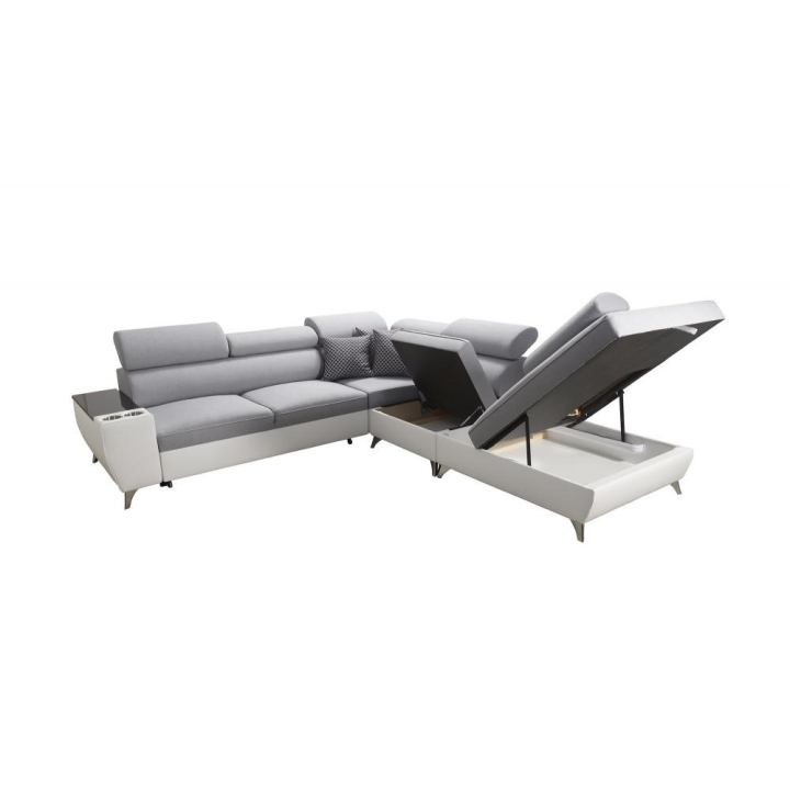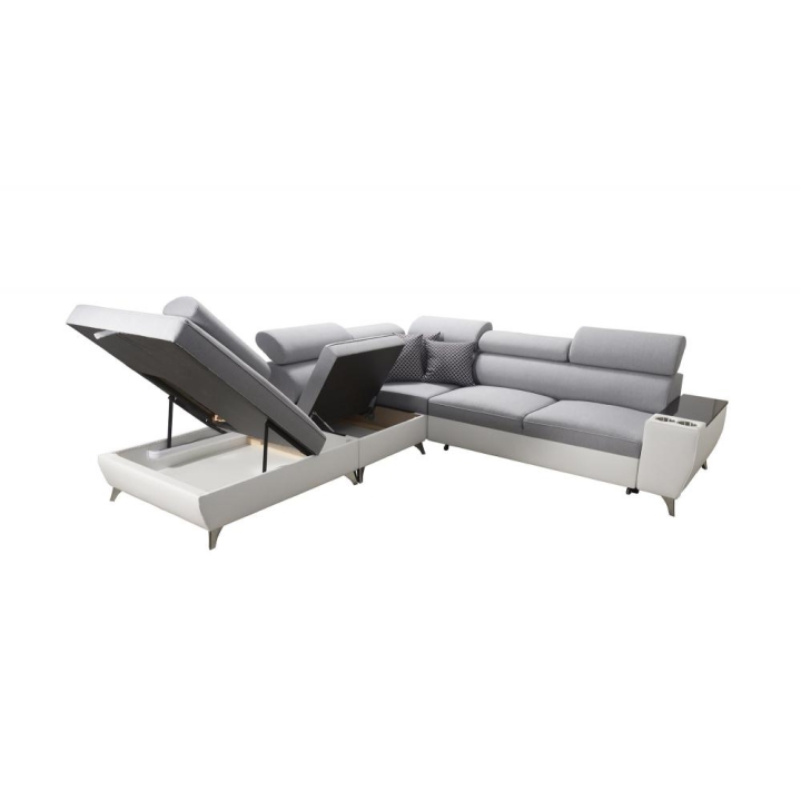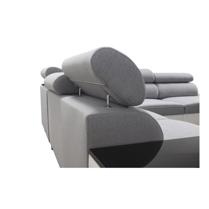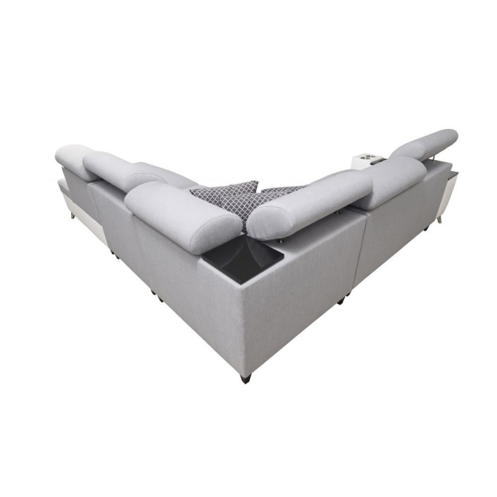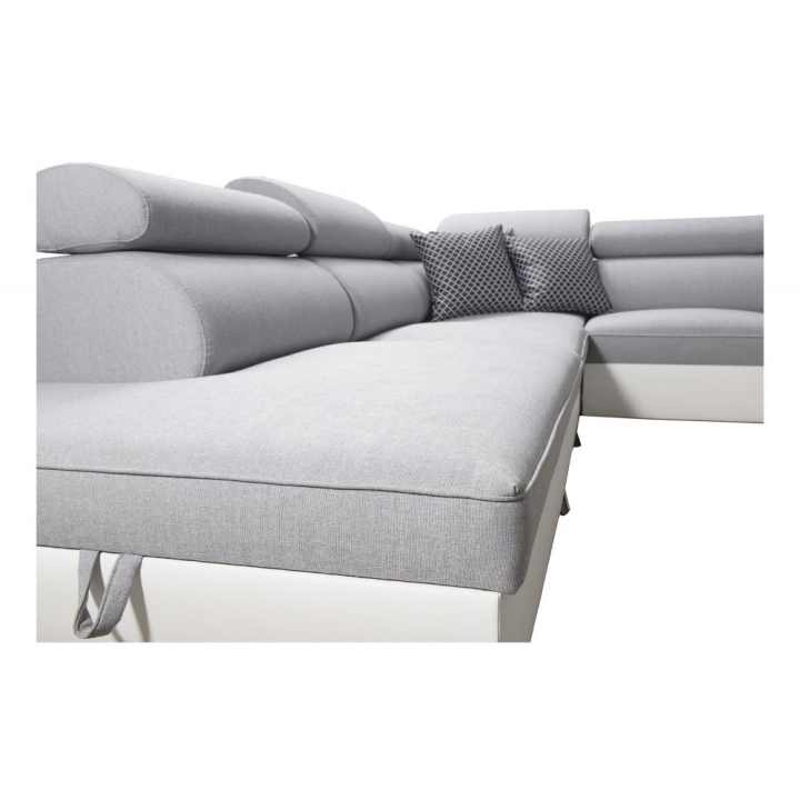 W standardzie mebel wyposażono w 6 regulowanych zagłówków, które umożliwiają indywidualne ustawienie podparcia. Do dyspozycji użytkownika pozostają także 2 pojemniki na pościel oraz otwierany barek, zwiększający zakres zastosowań narożnika. Poduszki widoczne na zdjęciu dołączane są gratis, co stanowi integralny element zestawu.
