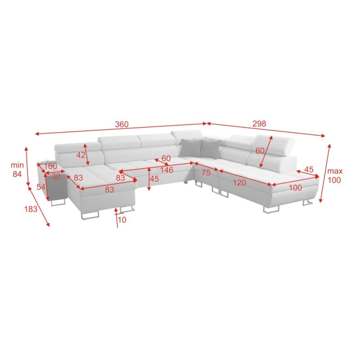 Bryła narożnika charakteryzuje się wyraźnie określonymi wymiarami: szerokość 360 cm, głębokość 298 cm oraz wysokość 100 cm. Wysokość siedziska 45 cm zapewnia wygodną pozycję siedzącą, natomiast krótszy bok o długości 100 cm pozwala na elastyczne ustawienie mebla w pomieszczeniu. Całość prezentuje się solidnie i proporcjonalnie, zachowując spójność formy.