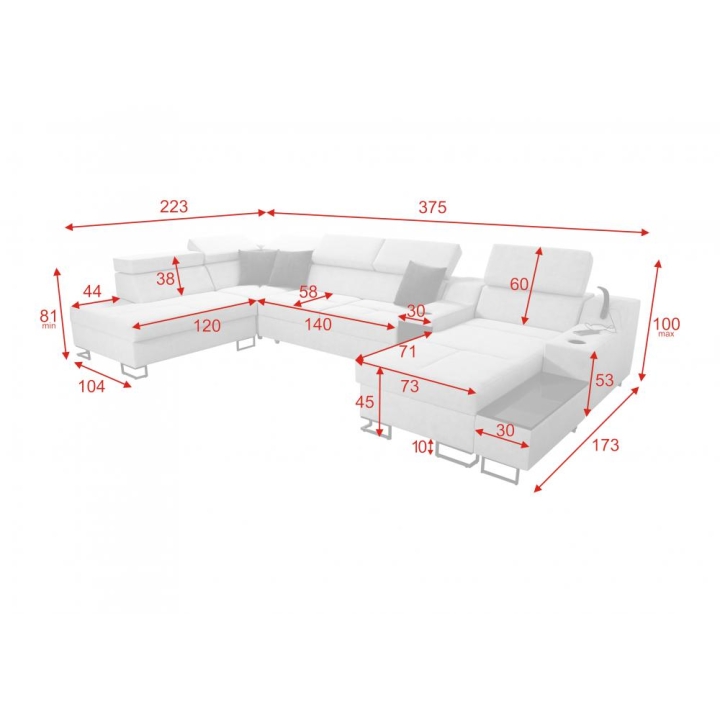 Narożnik Alicanto V Umebluje to rozbudowany mebel wypoczynkowy przeznaczony do przestronnych wnętrz, dostępny w wersji prawostronnej lub lewostronnej. Jego wymiary wynoszą 375 cm szerokości, 223 cm głębokości oraz 185 cm krótszego boku, co zapewnia wyraźnie zarysowaną strefę relaksu. Całkowita wysokość 100 cm oraz wysokość siedziska 45 cm zostały dobrane z myślą o zachowaniu właściwych proporcji bryły.