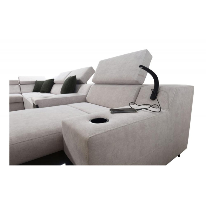 Wyposażenie obejmuje zestaw wielofunkcyjnej lampy z ładowaniem USB oraz elastycznym ramieniem, zasilanej 12V/230V i emitującej neutralną barwę światła. Do wyboru pozostają stopki przednie: metal chrom lub metal czarny mat, a także stopki tylne: drewniane w kolorze czarnym, białym, olcha, venge i buk lub chrom – za dopłatą 60 zł. Istnieje możliwość wyboru kubków w kolorze czarnym lub srebrnym oraz lampki w kolorze czarnym lub białym, a poduszki widoczne na zdjęciu dodawane są gratis.