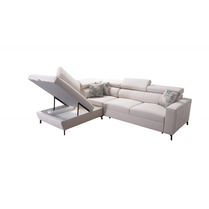 Dodatkowym atutem jest 1 pojemnik na pościel, dyskretnie wkomponowany w bryłę narożnika. Producent przewidział możliwość wyboru wykończenia podstawy: stopki z przodu w wersji metal chrom lub metal czarny mat. Stopki z tyłu dostępne są w wariantach drewnianych w kolorze czarnym, białym, olcha, venge i buk, a także chrom – za dopłatą.