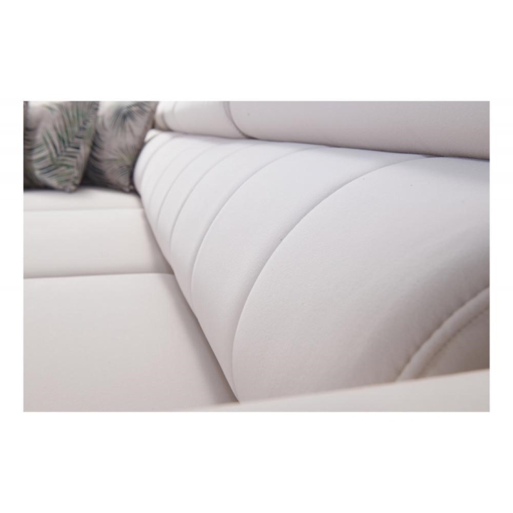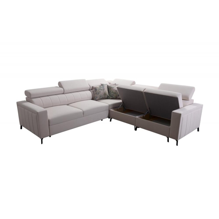Dodatkowym elementem wyposażenia są 2 pojemniki na pościel, które ułatwiają przechowywanie tekstyliów domowych. Z przodu mebla można wybrać stopki metalowe w wersji chromowanej lub czarny mat, natomiast z tyłu dostępne są stopki drewniane w kolorze czarnym, białym, olcha, venge i buk, a także chromowane za dopłatą. Tak szeroki wybór detali pozwala precyzyjnie dostosować wygląd narożnika do wnętrza.