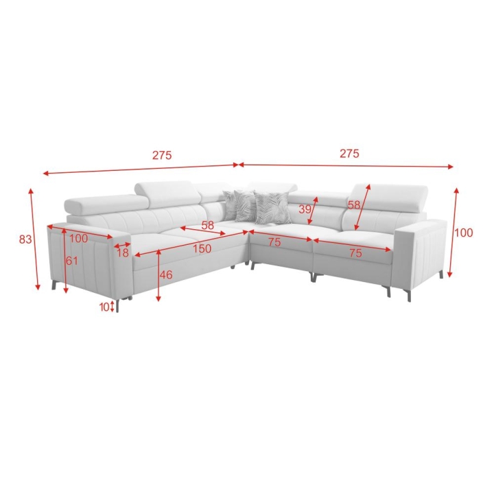 Model posiada imponujące wymiary: szerokość 275 cm oraz głębokość 275 cm, co zapewnia dużą powierzchnię użytkową. Po rozłożeniu dostępna jest powierzchnia spania 210 cm x 127 cm, umożliwiająca wygodny odpoczynek nocny. Wysokość siedziska wynosi 46 cm, natomiast maksymalna wysokość narożnika to 100 cm, co sprzyja ergonomicznemu podparciu ciała.