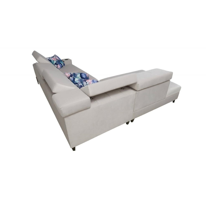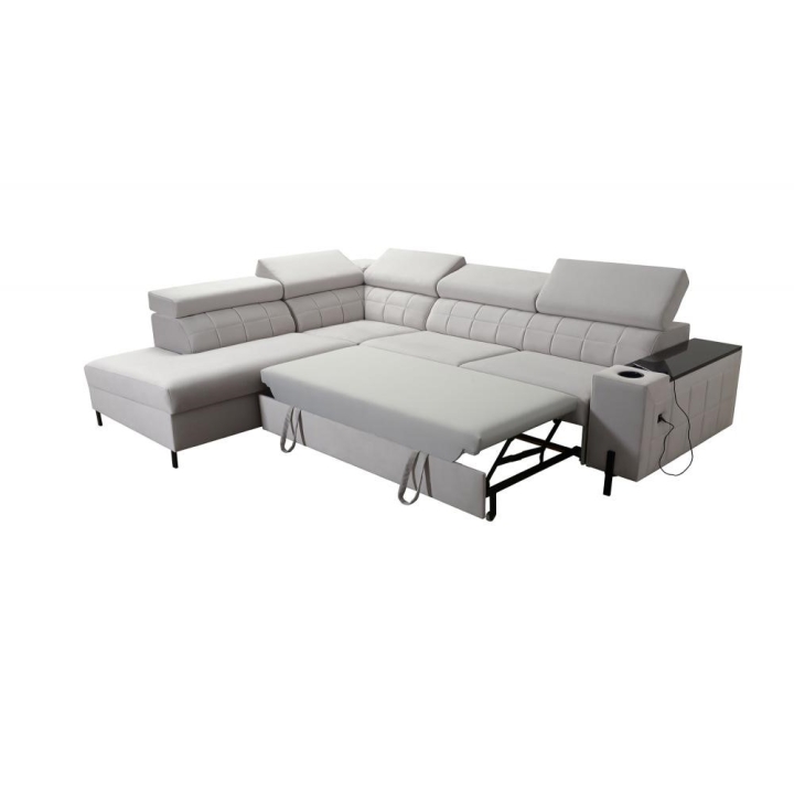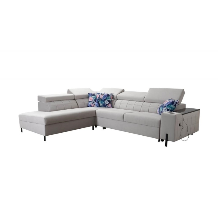 W wyposażeniu znajduje się 5 regulowanych zagłówków, pozwalających na indywidualne ustawienie podparcia. Narożnik posiada również 1 pojemnik na pościel, ułatwiający przechowywanie, oraz otwierany barek, który zwiększa zakres zastosowań mebla. Każdy z tych elementów został starannie wkomponowany w bryłę konstrukcji.