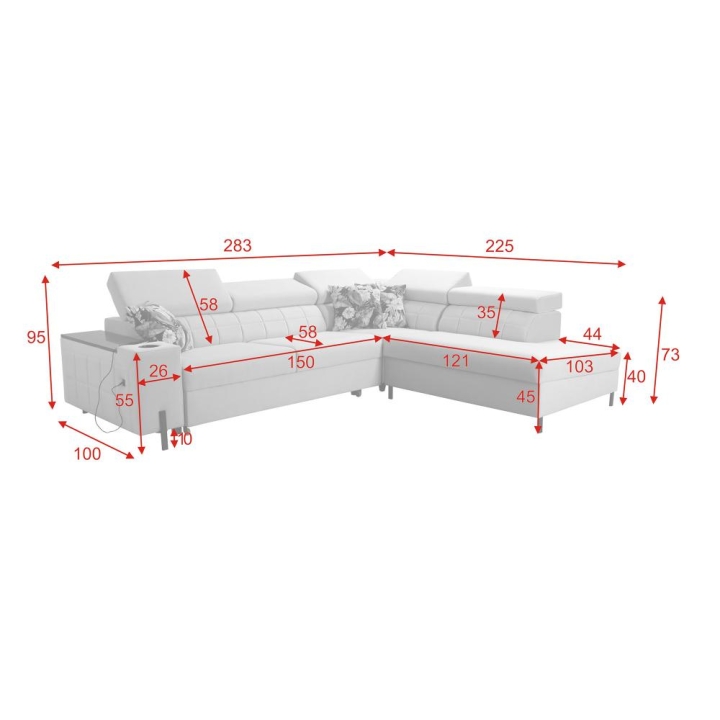 Model charakteryzuje się wymiarami 283 cm szerokości oraz 225 cm głębokości, co zapewnia odpowiednią ilość miejsca do wypoczynku. Po rozłożeniu oferuje powierzchnię spania 210 cm x 127 cm, umożliwiając komfortowy sen. Wysokość siedziska wynosi 45 cm, natomiast maksymalna wysokość narożnika to 95 cm.