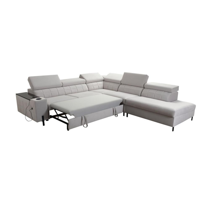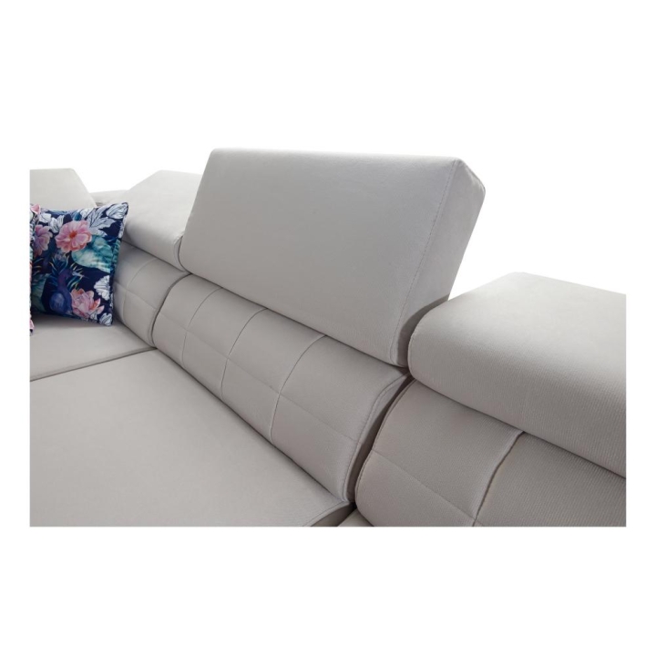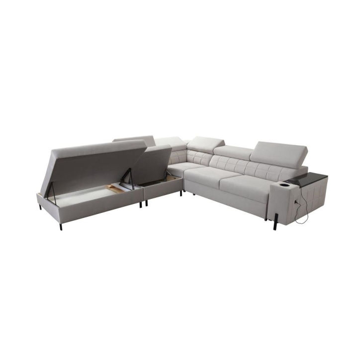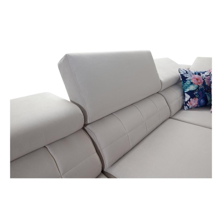 Mebel został wyposażony w 6 regulowanych zagłówków, które pozwalają na indywidualne ustawienie oparcia. Do dyspozycji użytkownika pozostają także 2 pojemniki na pościel oraz otwierany barek, dyskretnie wkomponowany w bryłę narożnika. Takie rozwiązania podnoszą komfort codziennego korzystania z mebla.