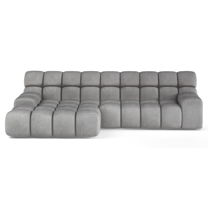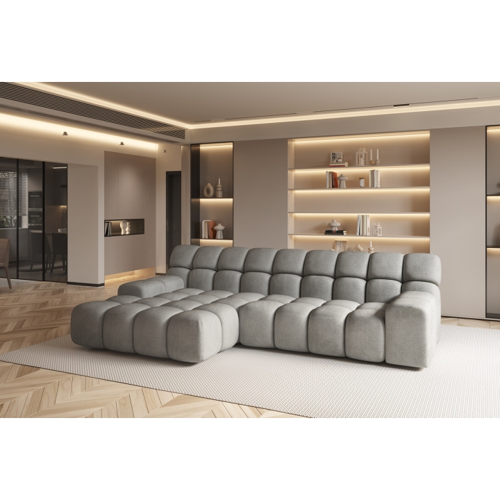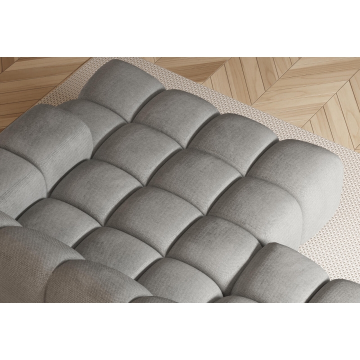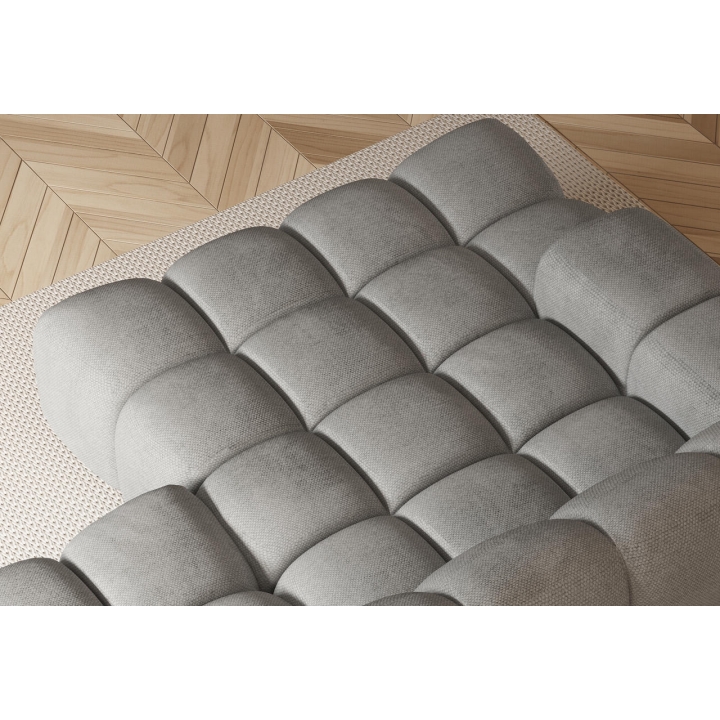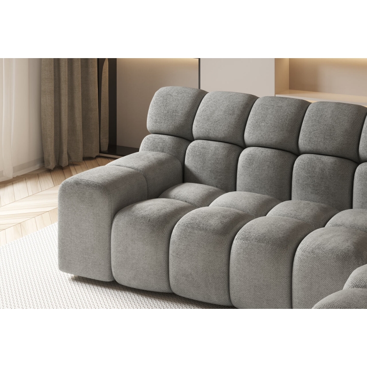 Narożnik Campile marki Wersal to rozbudowany mebel wypoczynkowy, dostępny w dwóch konfiguracjach – jako wariant lewostronny lub prawostronny. Konstrukcja przyciąga uwagę nietypowym wzornictwem, na które składają się dekoracyjne przeszycia tworzące charakterystyczny, rytmiczny układ na oparciu i siedzisku, przypominający formą regularne wypukłości. Całość zyskuje dzięki temu zdecydowany, geometryczny wyraz.