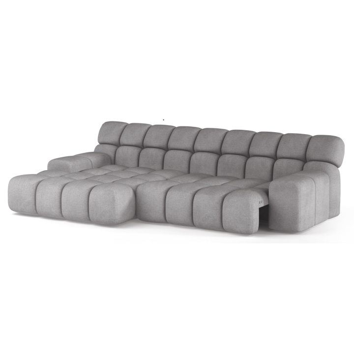 Największym atutem mebla jest mechanizm umożliwiający automatyczne wysunięcie siedziska – zwiększając jego powierzchnię aż o 27 cm. To rozwiązanie odpowiada na potrzebę większej przestrzeni w trakcie wypoczynku, zapewniając swobodę ruchu i dodatkową wygodę podczas użytkowania. Mechanizm działa płynnie i cicho, co dodatkowo podnosi komfort korzystania z narożnika.