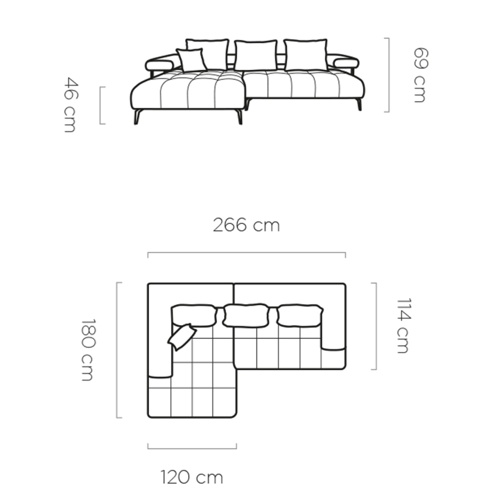 Wymiary narożnika to 266 cm szerokości, 180 cm głębokości w części z otomaną oraz 114 cm głębokości po stronie siedziska. Wysokość całkowita mebla wynosi 69 cm, a wysokość siedziska to 46cm. Jego głębokość – liczona wraz z poduszkami – to 58 cm, co zapewnia dużą powierzchnię do wypoczynku nawet w niewielkim metrażu.