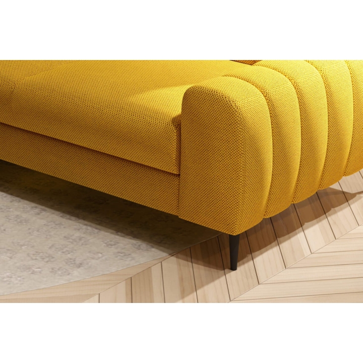 Zastosowany mechanizm rozkładania pozwala błyskawicznie przekształcić narożnik w przestrzeń do nocnego wypoczynku. Mebel wyposażono w system typu delfin, który polega na wysunięciu dolnej części i uniesieniu ukrytego materaca – uzyskując równą powierzchnię o wymiarach 116x194 cm. Takie rozwiązanie umożliwia komfortowy sen bez potrzeby rozstawiania dodatkowego łóżka. Praktycznym uzupełnieniem konstrukcji jest pojemnik umieszczony pod otomaną, który służy jako schowek na pościel lub inne tekstylia domowe.