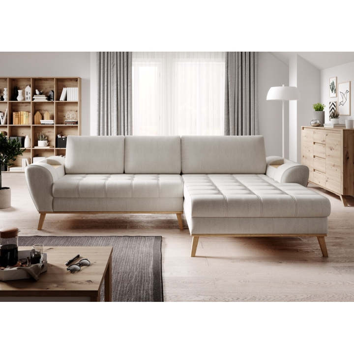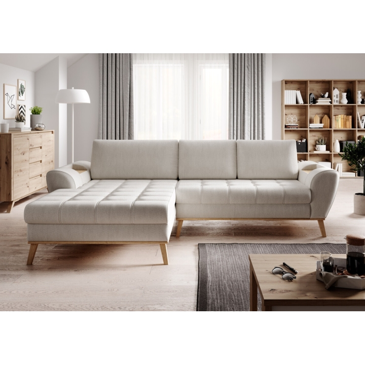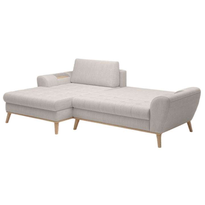 W podłokietnikach narożnika umieszczono starannie wkomponowane wnęki z drewnianymi półeczkami - to nietuzinkowe rozwiązanie, rzadko spotykane w meblach tego typu, znacząco podnosi komfort codziennego użytkowania. Tego rodzaju detale sprawdzają się znakomicie jako miejsce na książkę, okulary czy filiżankę napoju, umożliwiając relaks bez potrzeby sięgania po dodatkowe stoliki. Konstrukcja mebla oparta na smukłych, drewnianych nóżkach nadaje bryle wizualnej lekkości, a jasne drewno dodaje całości naturalnego wyrazu.