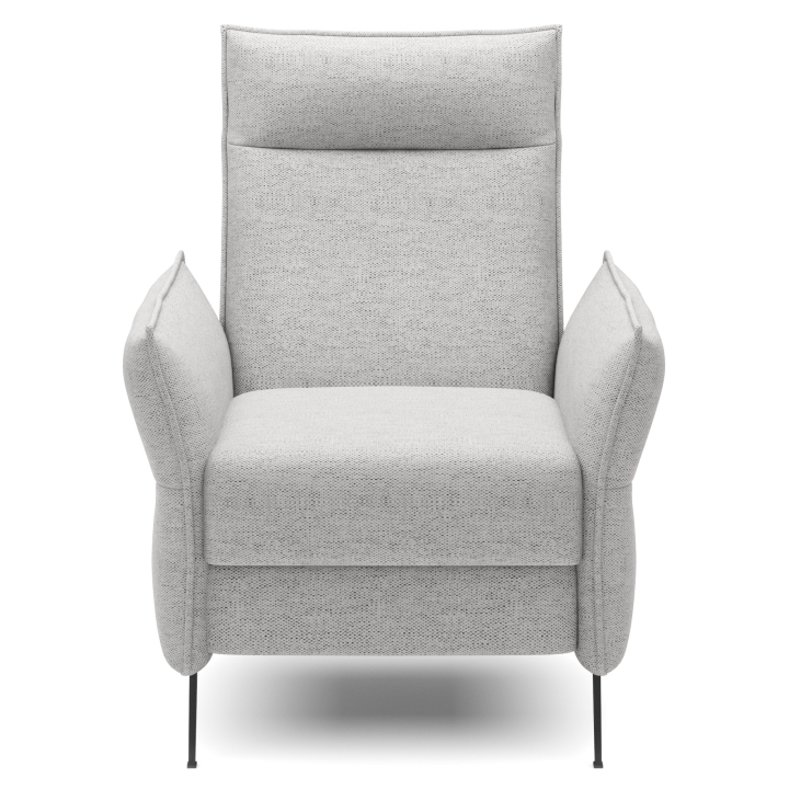 Całość wsparta jest na czarnych metalowych nogach o wysokości 15 cm, które zapewniają stabilność i ułatwiają utrzymanie czystości pod meblem. Ich konstrukcja dopełnia nowoczesny charakter fotela.