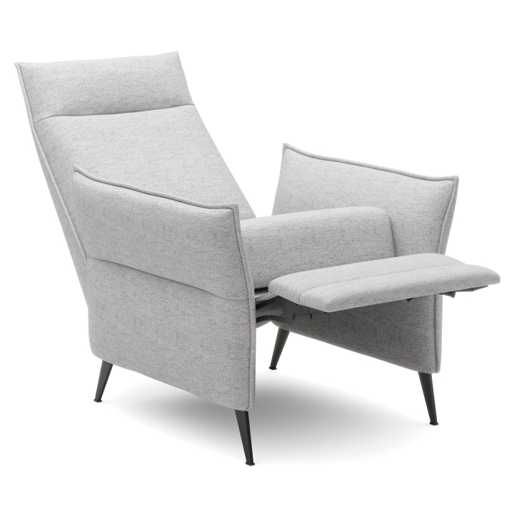 Model wyposażono w manualną funkcję relax, umożliwiającą płynne rozłożenie oparcia i podniesienie podnóżka, co wspomaga odprężenie. Całość wspierają czarne metalowe nogi o wysokości 15 cm, które zapewniają stabilność oraz łatwiejszy dostęp do przestrzeni pod meblem. Mechanizm rozkładania działa lekko i nie wymaga dużego wysiłku.