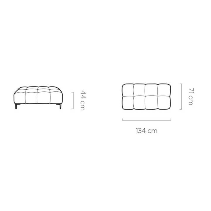 Jej wymiary to szerokość 134 cm, wysokość 44 cm oraz głębokość 71 cm, co czyni ją wyważoną pod względem proporcji. Konstrukcja oparta jest na smukłych, metalowych nóżkach w kolorze czerni, które nadają bryle lekkości i nowoczesnego wyrazu. Dzięki temu pufa subtelnie unosi się nad podłogą, nie obciążając optycznie przestrzeni.
