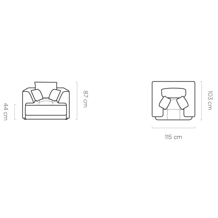 Mebel mierzy 115 cm szerokości, 87 cm wysokości i 103 cm głębokości, a jego siedzisko umieszczono na wysokości 44 cm. Delikatne przeszycia na siedzisku dyskretnie podkreślają strukturę tkaniny obiciowej, dodając jej wyrafinowanego charakteru. Głębokość siedziska wynosi 79 cm w wersji bez poduszki oparciowej, natomiast głębokość siedziska z poduszką oparciową to 57 cm.