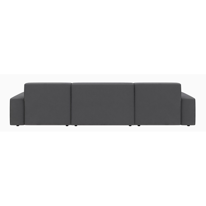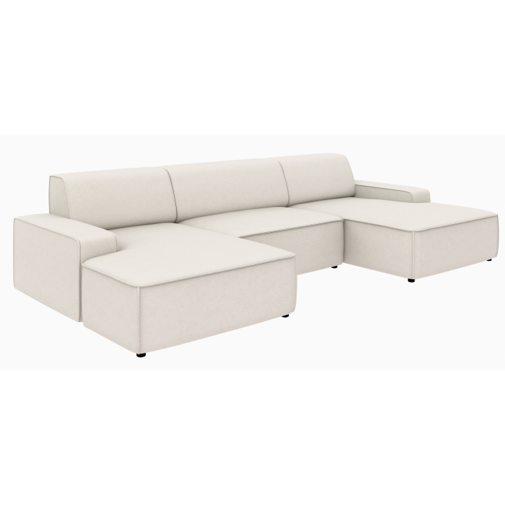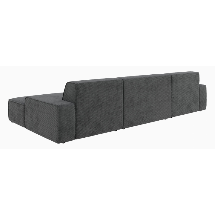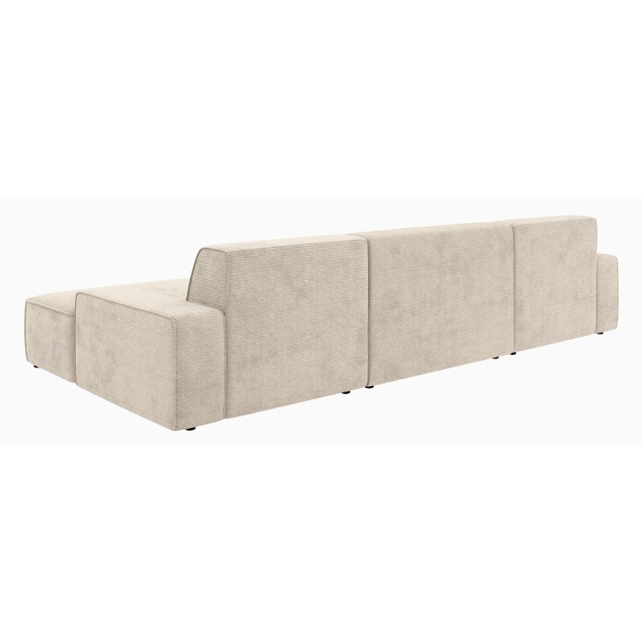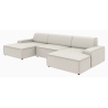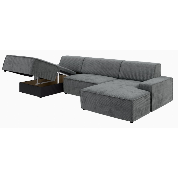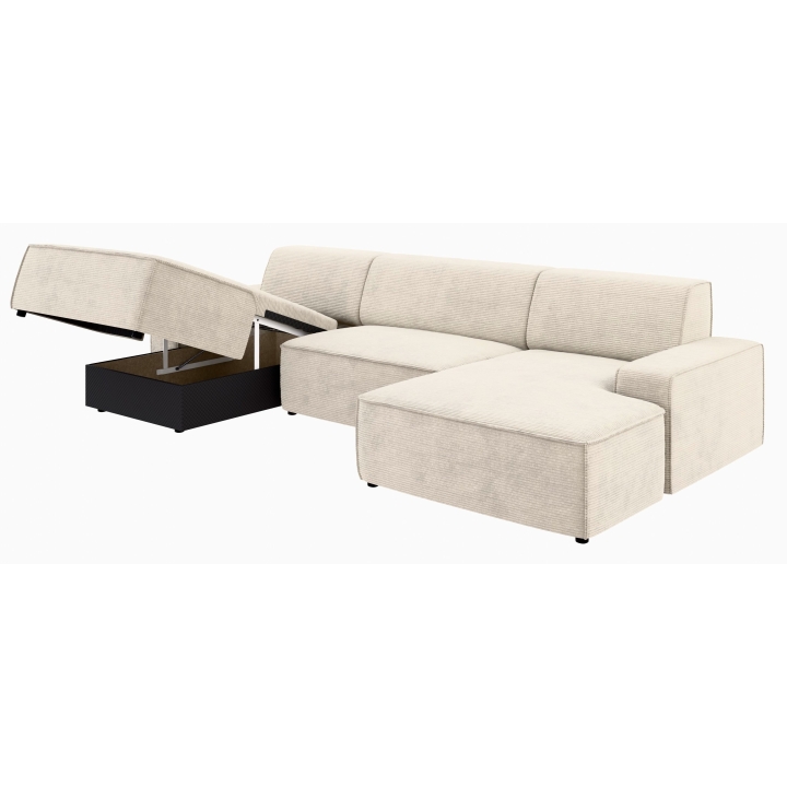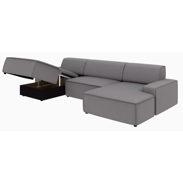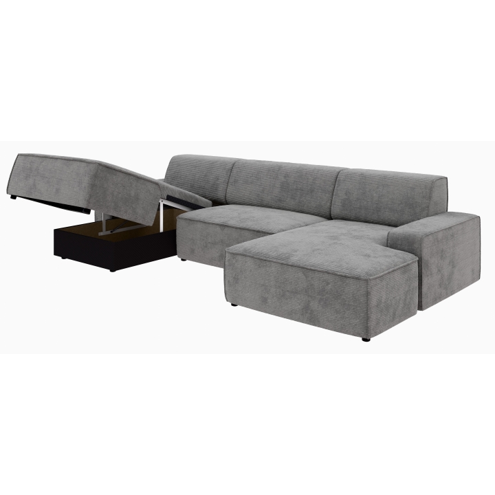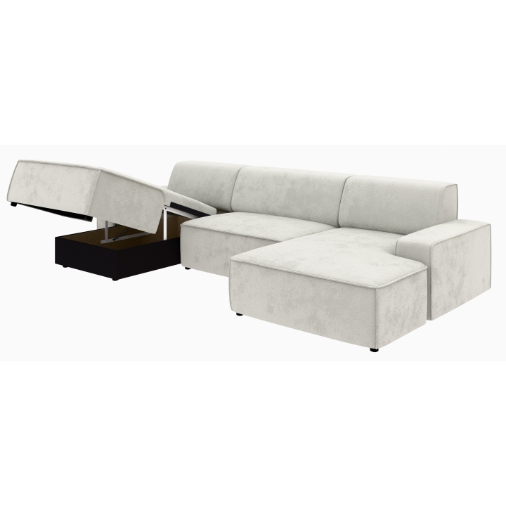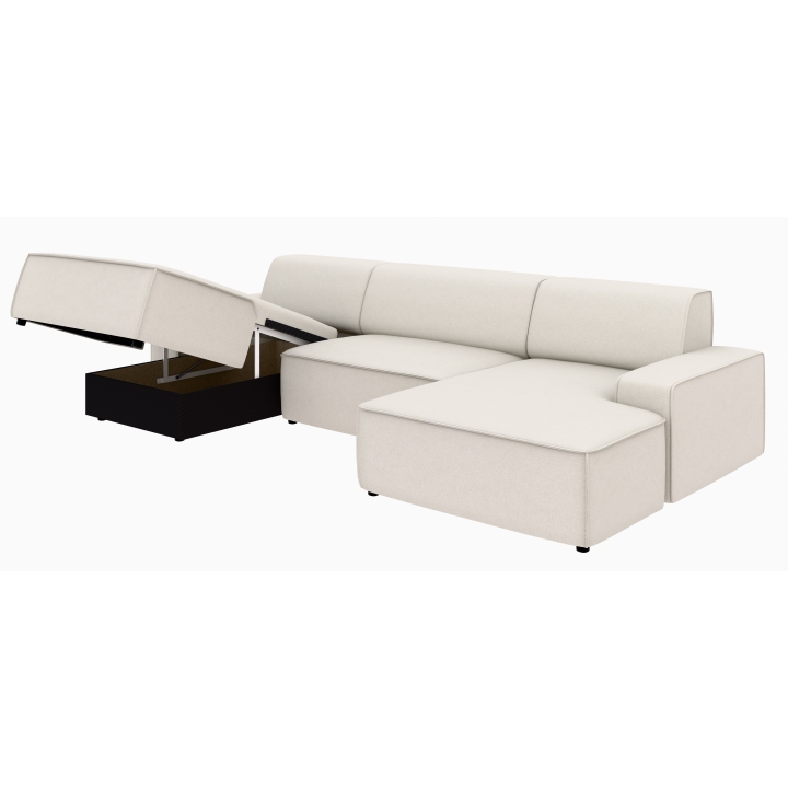 Po dodaniu pufa można wypełnić przestrzeń pomiędzy szezlongami, co daje powierzchnię do spania o wymiarach 281 x 123 cm. To rozwiązanie szczególnie przydatne podczas okazjonalnych noclegów gości. Pojemnik na pościel umieszczony w konstrukcji narożnika pozwala na przechowywanie dodatkowych tekstyliów, utrzymując porządek w salonie.