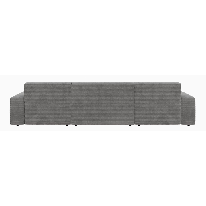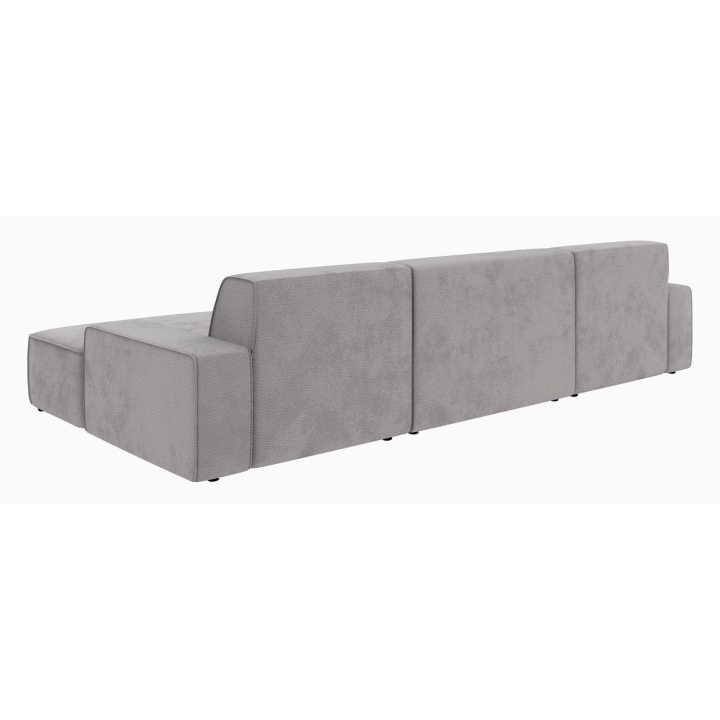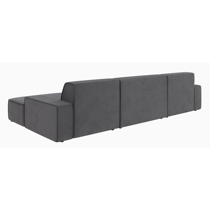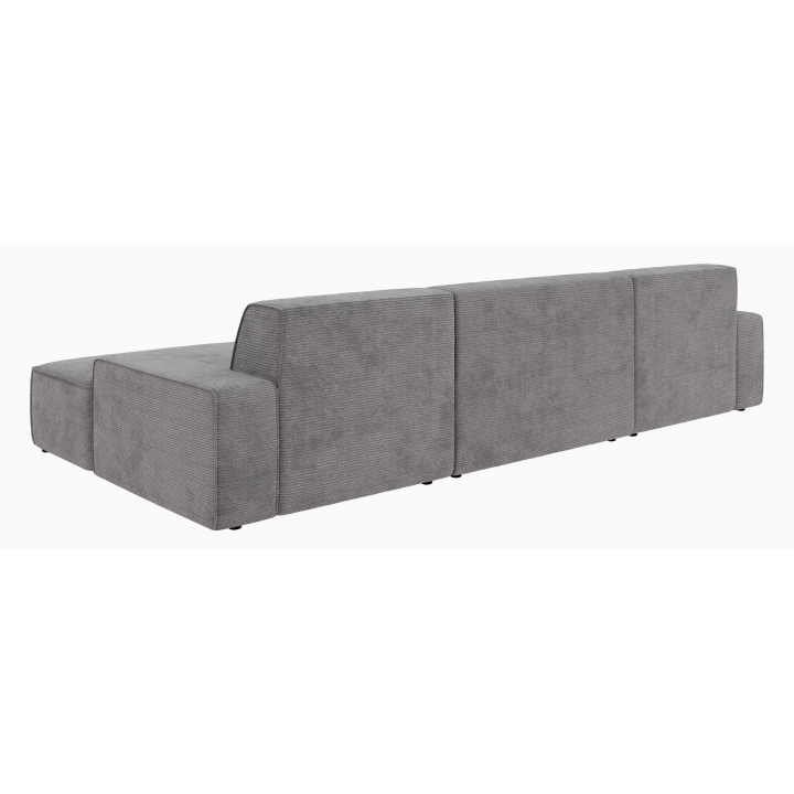Wysokość siedziska wynosi 44 cm, natomiast jego głębokość to 57 cm, co pozwala na swobodne i wygodne korzystanie z narożnika. Całość wspierają czarne, matowe nóżki z tworzywa o wysokości 4,5 cm, które nadają całości lekkiego wyglądu, a jednocześnie gwarantują stabilność. Narożnik nie posiada standardowej funkcji spania, jednak oferuje inną opcję rozbudowy.